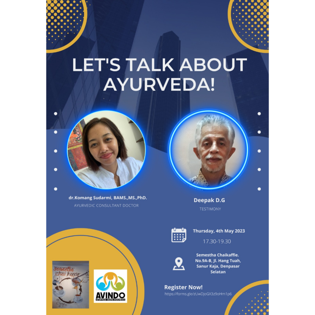 dr. Komang memberikan pengenalan singkat tentang apa itu Ayurveda dan bagaimana pola makan sehat berpengaruh bagi kesehatan. Sedangkan Mr. Deepak D.G sebagai narasumber kedua membagikan pengalamannya dalam menjalankan pola makan sehat ala Ayurveda dalam menyembuhkan penyakitnya. Sebagian besar peserta ternyata sudah familiar dengan Ayurveda dan sudah pernah melakukan treatment Ayurveda.