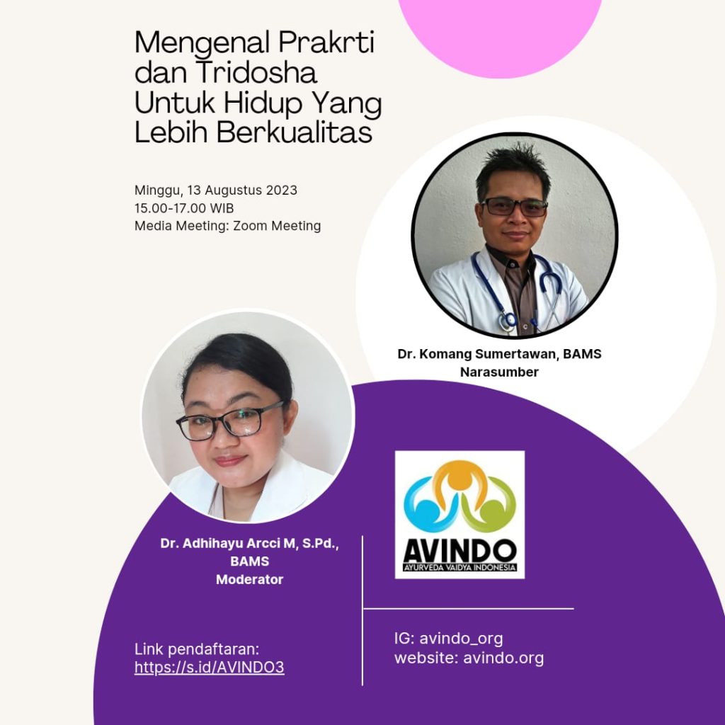 Ayurveda Vaidya Indonesia atau Avindo kembali menggelar webinar ke tiganya tahun ini dengan tema yang tidak kalah menarik yaitu mengenal “Prakriti dan Tridosha Untuk Hidup Yang Lebih Berkualitas,” webinar kali ini kita mengundang salah satu Dokter Ayurveda yaitu Dr. Komang Sumertawan BAMS, bliau adalah seorang praktisi Ayurveda yang saat ini bekerja disalah satu Ayurvedic Centre di Bali. Webinar ini dipandu oleh Dr. Kadek Dwi Muras Mei Permata Sari BAMS, selaku MC pada webinar ini. Meskipun webinar kali ini diadakan ditengah perayaan Hari Raya Suci Galunagn dan Kuningan hal ini tidak mengurangi antusiasme para peserta untuk mengikuti Webinar dengan tujuan mendapatkan informasi dan ilmu baru mengani Ayurveda. Webinar dimulai tepat pukul 15.00 Wib dan dimoderatori oleh Dr. Adhihayu Acrci Maharddhika BAMS.