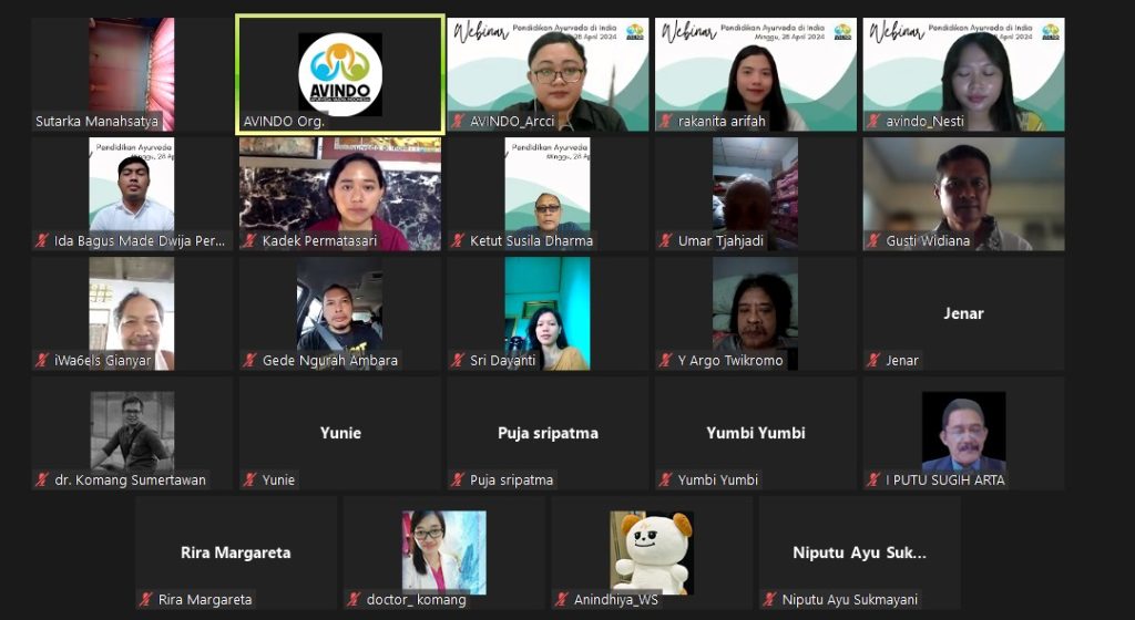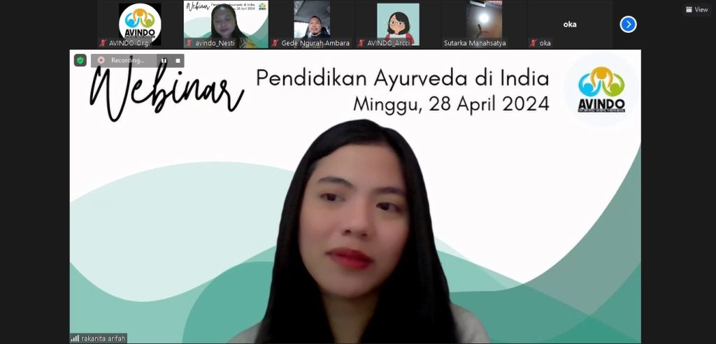 Pada minggu 28 April 2024 Avindo kembali menyelenggarakan seminar online series ke 7, kali ini seminar Avindo mengangkat topik yang cukup menarik yaitu tentang Pendidikan Ayurveda di India. Seminar Avindo kali ini ditujukan untuk masyarakat Indonesia yang ingin mencoba untuk melanjutkan pendidikan dibidang Ayurveda di India. Pada webinar ini Avindo berkesempatan untuk mengundang narasumber yaitu Rakanita Arifah seoarang mahasiswa Ayurveda yang pada saat ini sedang mengenyam pendidikan disalah satu Ayurvedic College di India. Webinar ini dipandu langsung oleh Dr. Herminesti selaku moderator dan juga diikuti oleh para peserta dari berbagai wilayah di Indonesia. Pada pemaparannya Rakanita menjelaskan mengenai Pendidikan Ayurveda jejang S1 di India, beliau menjelaskan mengenai mata pelajaran dari tahun pertama hingga tahun terakhir, system belajar di India, fasilitas yang didapatkan pada masa belajar, kegiatan yang dilakukan pada masa belajar dan juga suasana belajar di India. Selain menjelaksan tentang proses belajar Ayurveda di India, Rakanita juga berbagi informasi mengenai proses Internship selama 1 tahun yang wajib dilaksanakan oleh mahasiswa Ayurveda setelah masa belajar selesai.